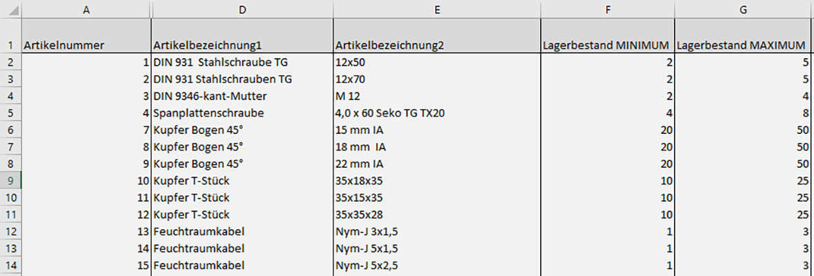 - Eine fest definierte Mindestmenge, die immer am Lager vorrätig sein muss (siehe Spalte F)