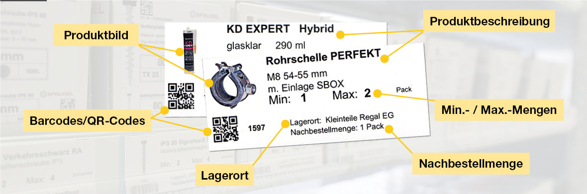 Ein Handwerksbetrieb hat je nach Gewerk 1000 bis 3500 Standardartikel am Lager, für welche jeweils eine entsprechende Regalbeschriftung erstellt werden muss. Eine manuelle Erstellung dieser Etiketten wäre extrem aufwändig und zeitintensiv.