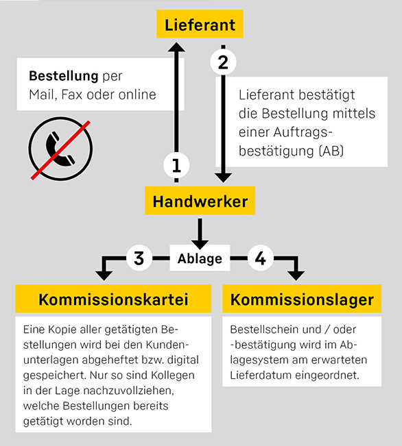 Eine Kopie aller getätigten Bestellungen wird bei den Kundenunterlagen abgeheftet bzw. digital gespeichert. Nur so sind andere Mitarbeitende in der Lage nachzuvollziehen, welche Bestellungen bereits getätigt worden sind.